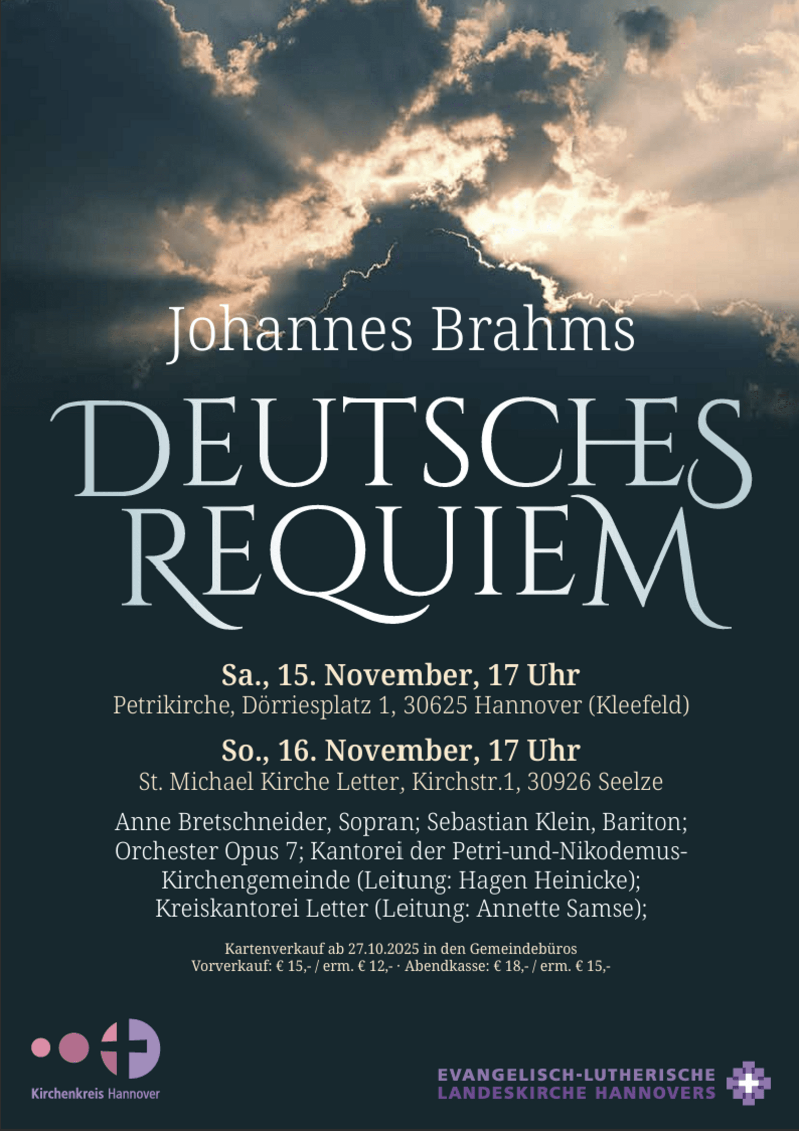 Am Sonntag, dem 16. November um 17 Uhr führt die Kantorei St. Michael Letter zusammen mit der Kantorei der Petri-und-Nikodemus-Kirchengemeinde Kleefeld